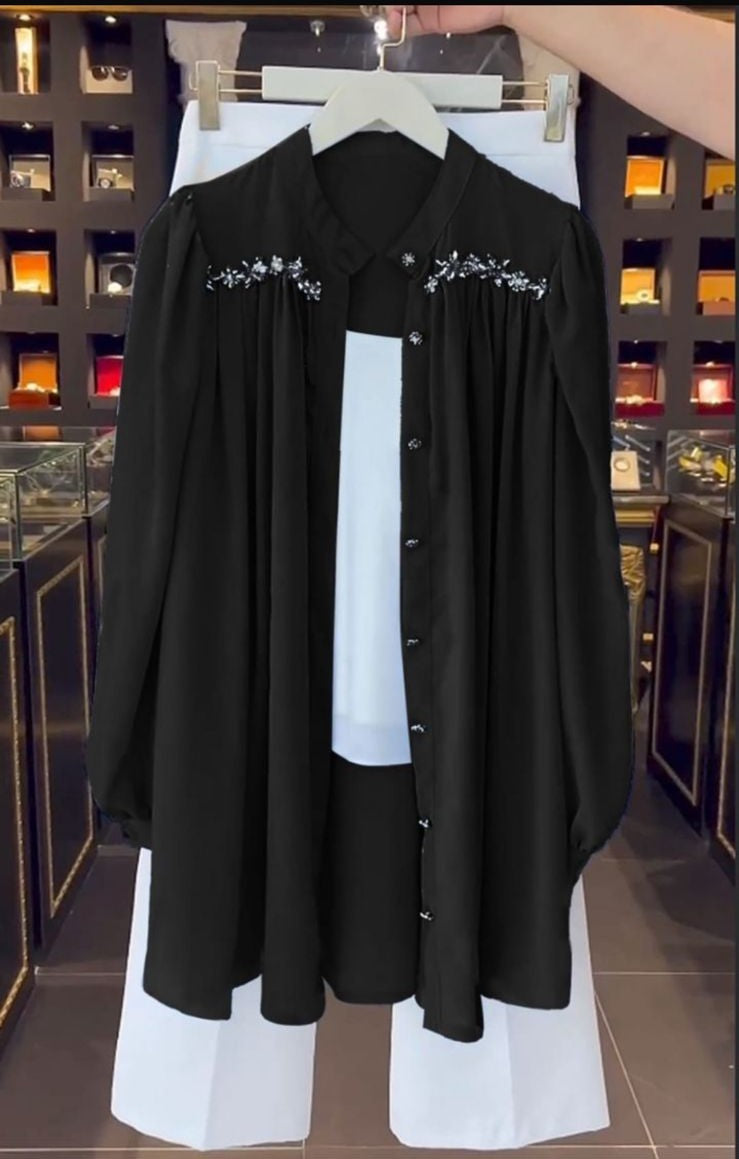 Achieve instant drama and elegance with this timeless Black Chiffon Long Shrug. Designed as a sophisticated layering piece, this versatile shrug adds a polished finish to any ensemble, perfect for transitioning from day to evening wear.